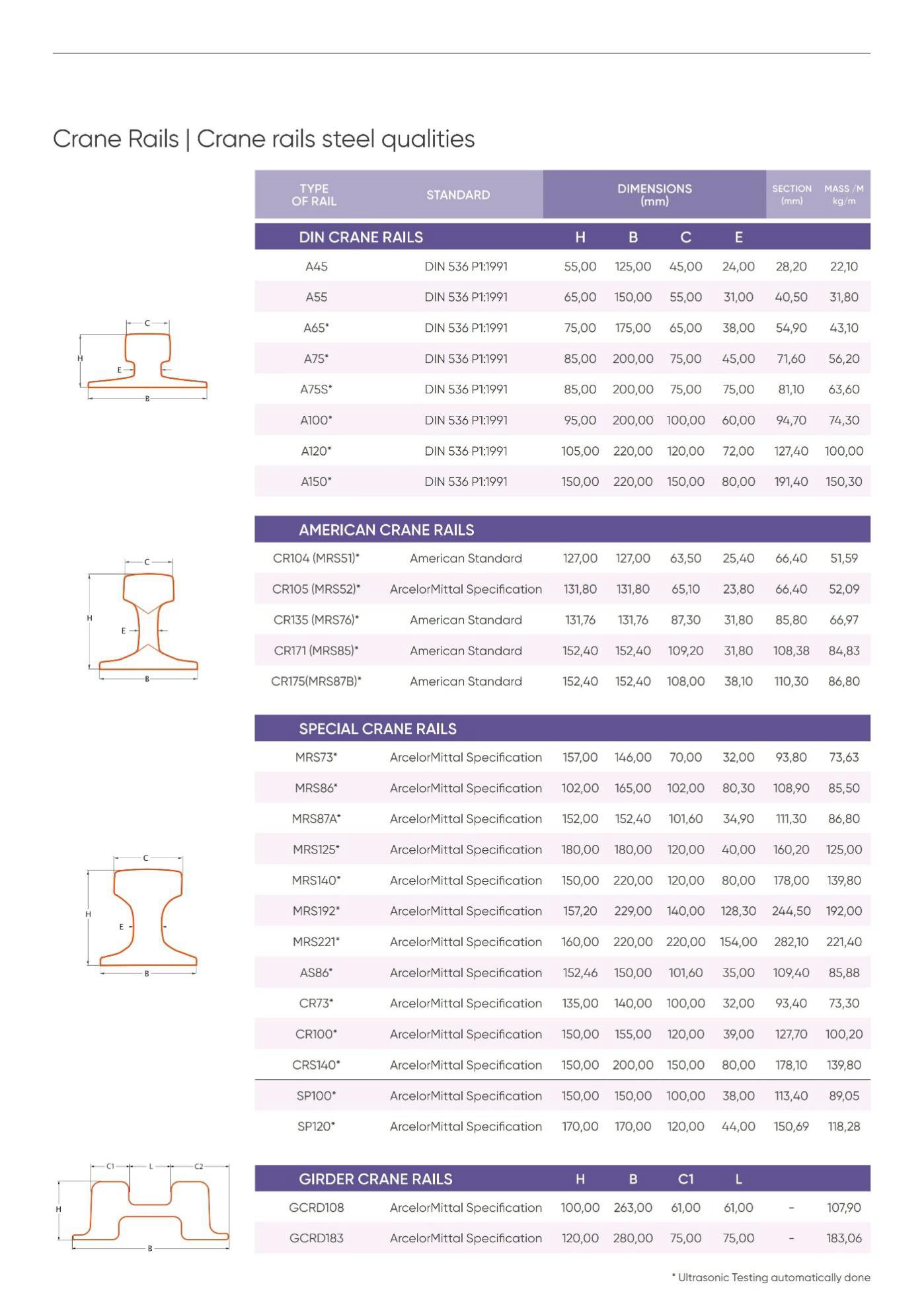 Information on different crane rails profiles according to the different standards: European, American and ArcelorMittal specifications: